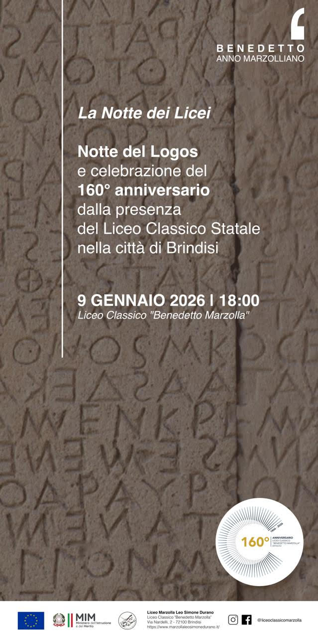 BRINDISI – Il liceo Classico di Brindisi per i suoi 160 anni apre le porte alla città con una serie di eventi. Venerdì 9 gennaio dalle ore 18.00 presso il Liceo Classico “Benedetto Marzolla” si terrà La Notte dei Licei – Notte del Logos, appuntamento ormai tradizionale del panorama culturale cittadino che, quest’anno, assume un significato del tutto particolare. L’evento segna infatti l’avvio ufficiale delle celebrazioni per il 160° anniversario della presenza del Liceo Classico statale a Brindisi, un traguardo che racconta una lunga storia di formazione, cultura e impegno civile.